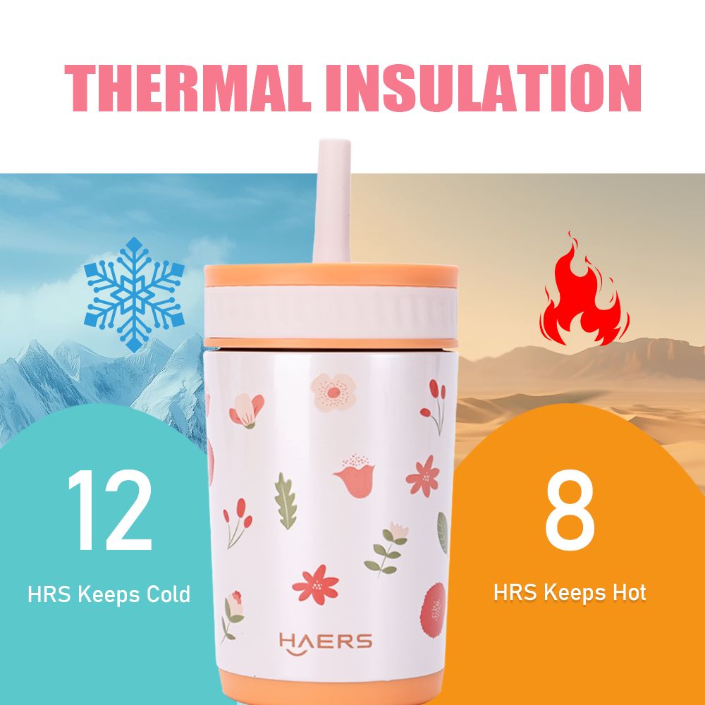 A safe and durable stainless steel kids tumbler featuring long-lasting insulation, an easy-sip straw lid, and a wide mouth for easy filling and cleaning.