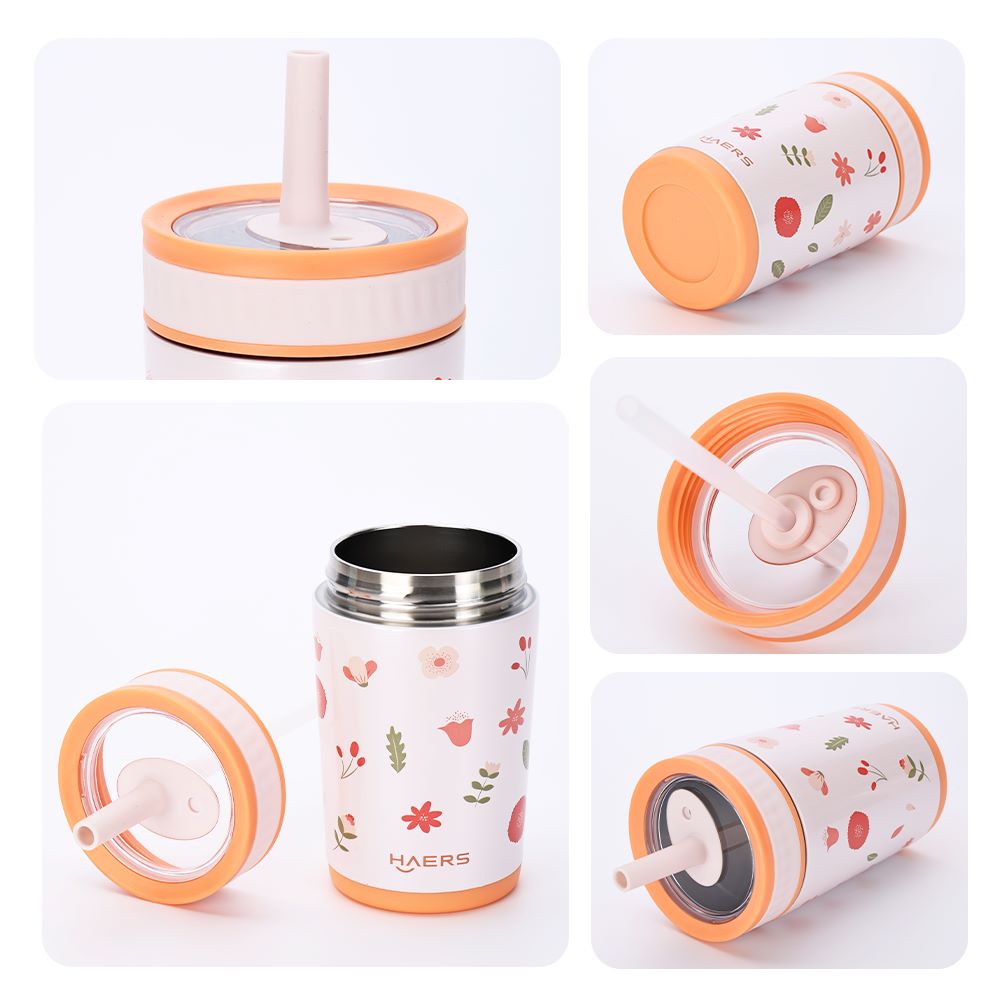 Crafted with food-grade 304 stainless steel (inside/out), it has silicone straw and BPA-free parts. Features dual-wall vacuum insulation (12h hot/cold), push-button flip lid for one-handed use, and child-friendly design with silicone suction nozzle, one-handed stopper, and wide mouth. The outer lid doubles as a drinking cup while protecting the nozzle.