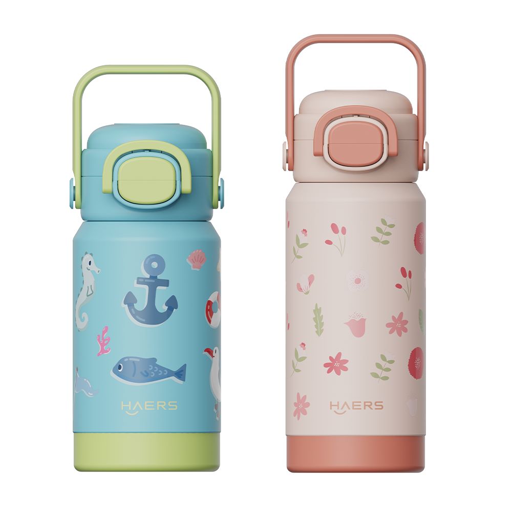 Haers Stainless Steel Water Bottle for Kids is made of durable food-grade 316 stainless steel inside and 304 stainless steel outside, with BPA-free parts and a silicone suction nozzle for safety. It features double wall vacuum insulation, a flip-up lid for easy one-handed use. Custom logo and finish options are available.
