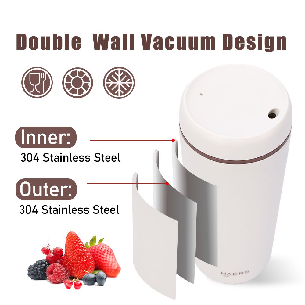 Haers high-quality insulated coffee mug is made of food-grade 304 stainless steel both inside and outside, with a BPA-free lid. Its double-wall structure and excellent insulation performance keep beverages hot or cold for up to 12 hours. The mug also features a comfortable handle and customizable surface finishes and logos.