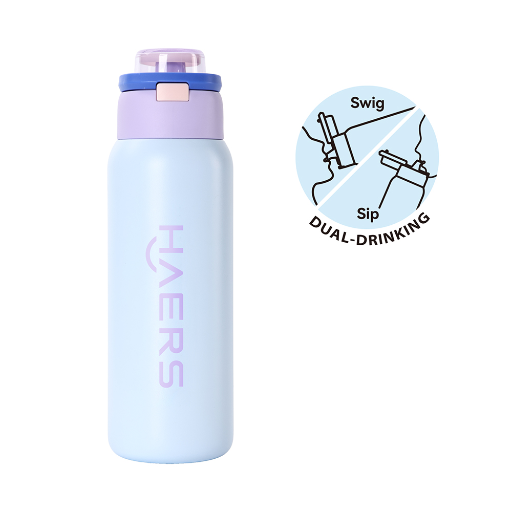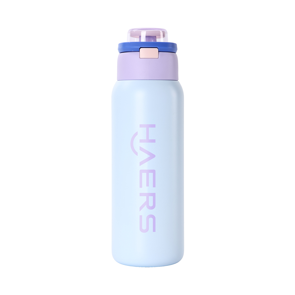 Haers Stainless Steel Water Bottle for Kids is made of durable food-grade 316 stainless steel inside and 304 stainless steel outside, with BPA-free parts and a silicone suction nozzle for safety. It features double wall vacuum insulation, a flip-up lid for easy one-handed use. Custom logo and finish options are available.